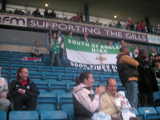 The match was 0-0 so I hadn’t missed anything, and we were looking good. A rain swept Stacey Hall took the ball down the line a few times and I yelled “GIve us a wave Stacey!” I doubt even Alan Scott heard me…soon though it was half time and there didn’t appear to be any allocated seats so the five of us decided to move, find more Northern Ireland fans (there were bound to be some) and put our SOE NISC fleg up and hope for a Northern Ireland win. There was always hope! The match was 0-0 at half time and we left our seats, taking a right as Northern Ireland were playing that was the second half. I headed straight for a steward to ask where I could put my fleg up, and if we could put it behind the nets. The steward was a total wanker and told me I couldn’t put it up. For fuck’s sake mate, I’m a football fan, I’m a chairman and all I wanted was to put our fleg up and support my team. Biggest wanker in the world – that steward at Gillingham that day.