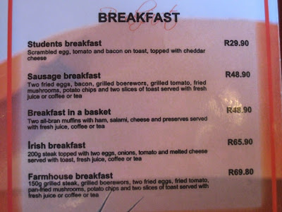 I was hungry but despite them having Irish breakfasts and some decent grub options, I decided to save my money. I was on a stop over you see, and my bus was heading onwards from Nelspruit to Johannesburg so I figured I could save money by getting some hot food to take on the bus (which I did for much cheaper). Incidentally divide most of the South African Rand figures by 10 and you get the price in British Pounds, therefore an Irish breakfast here in Nelspruit would skin you 6 pounds 50.