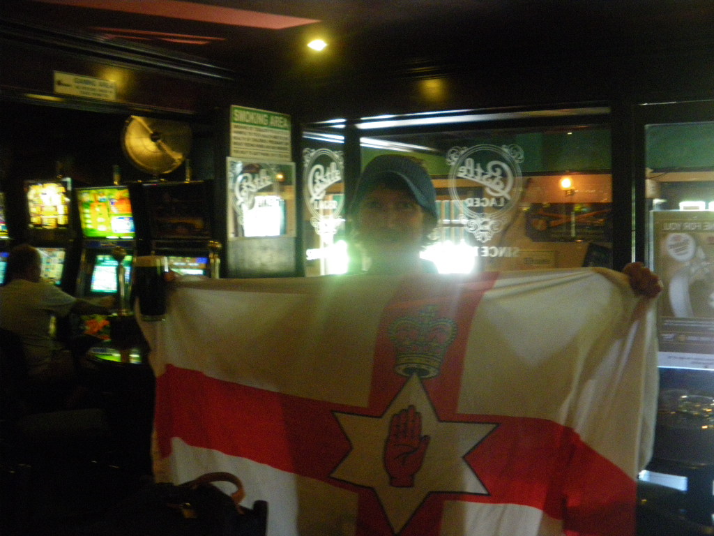 There were fruit machines in a separate section and the pub wasn’t busy (given it was around 12noon). But the music was good and the decor was typically Irish. I got my Northern Ireland flag out for a photo of course. All the staff were local South Africans, this was possibly the first Irish Bar I had been in without a white person working there. Oddly there were a few other white customers though.