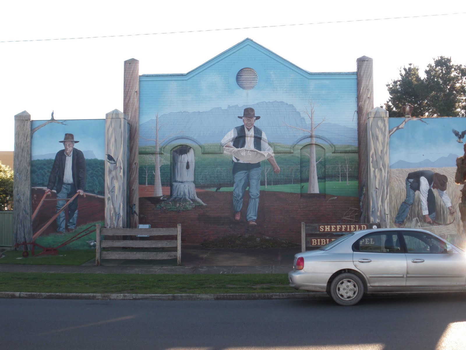 Sheffield is a town. It’s in the northern part of Tasmania. Pretty close to Devonport.