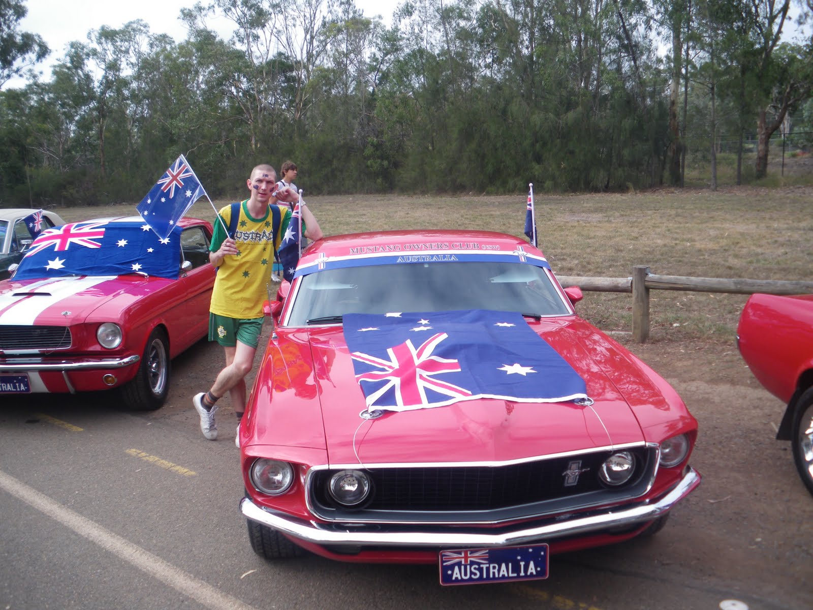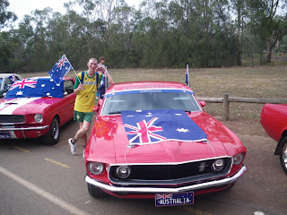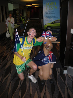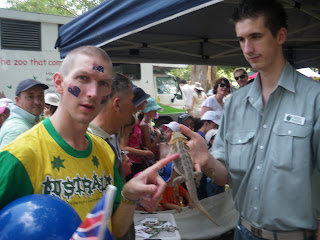 My other room mate, Daniel refused to get up – lying in, and missing some of the great free entertainment! But Neil and I had already arrived at Parramatta Park by 6.45 am and already the place was packed!! I had my green and yella Australia T-shirt on me, and my green Northern Ireland football shorts. Green and yellow seem to be the main colours of Australia – the rugby, cricket and football teams all play in these colours. Even though the national fleg is red, white and blue, and includes a quarter size union fleg (sometimes referred till as a union jack) in the top right. I also bought a mini Australian fleg for the day ($1) and had my 3 free fleg tattoos from the night before.