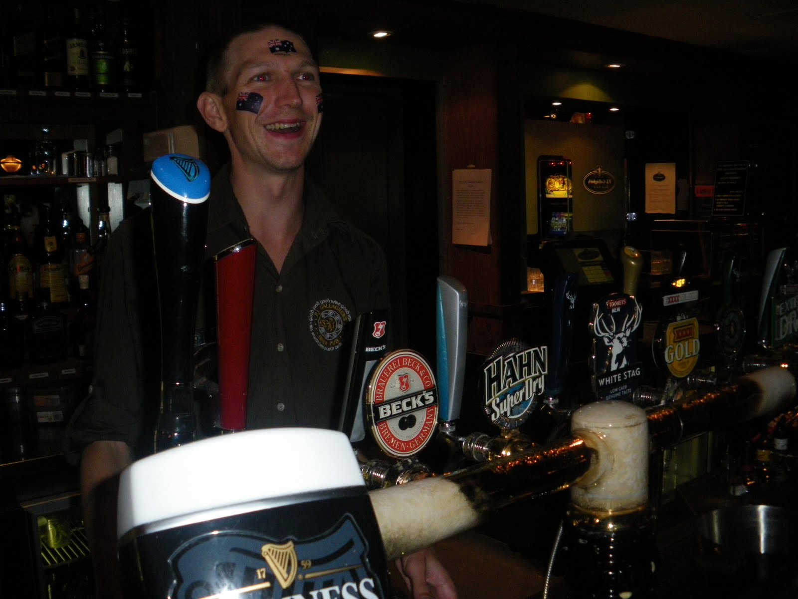 I spoke to her a few times during the night, and near the start I got her to put 3 of the temporary tattoos on my face – 3 of the Australian fleg. Her name was Codi and she was also the camerawoman for the night. The photos from nights in PJ Gallagher’s are put up on the PJ Gallagher’s Website and on the Facebook page. I’ve appeared in quite a few of them. The night got busy and we were rammed behind the bar serving away right through until 1.30 am when the DJ stopped.