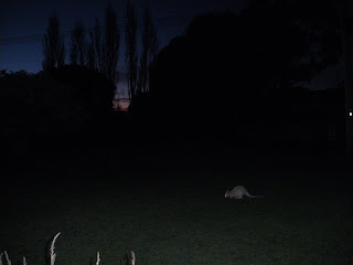 I had to be ultra careful not to scare it away, I thought, as this could be a once in a lifetime moment. I may never see another on of these again. I crept up slow and it saw me. Stared at me. The white wallaby looked cute and beautiful. It also looked sad and lonely. Like an outcast on its own amongst all these darker furred wallabies. It was easy to spot the white one against a green background and a darkening sky.