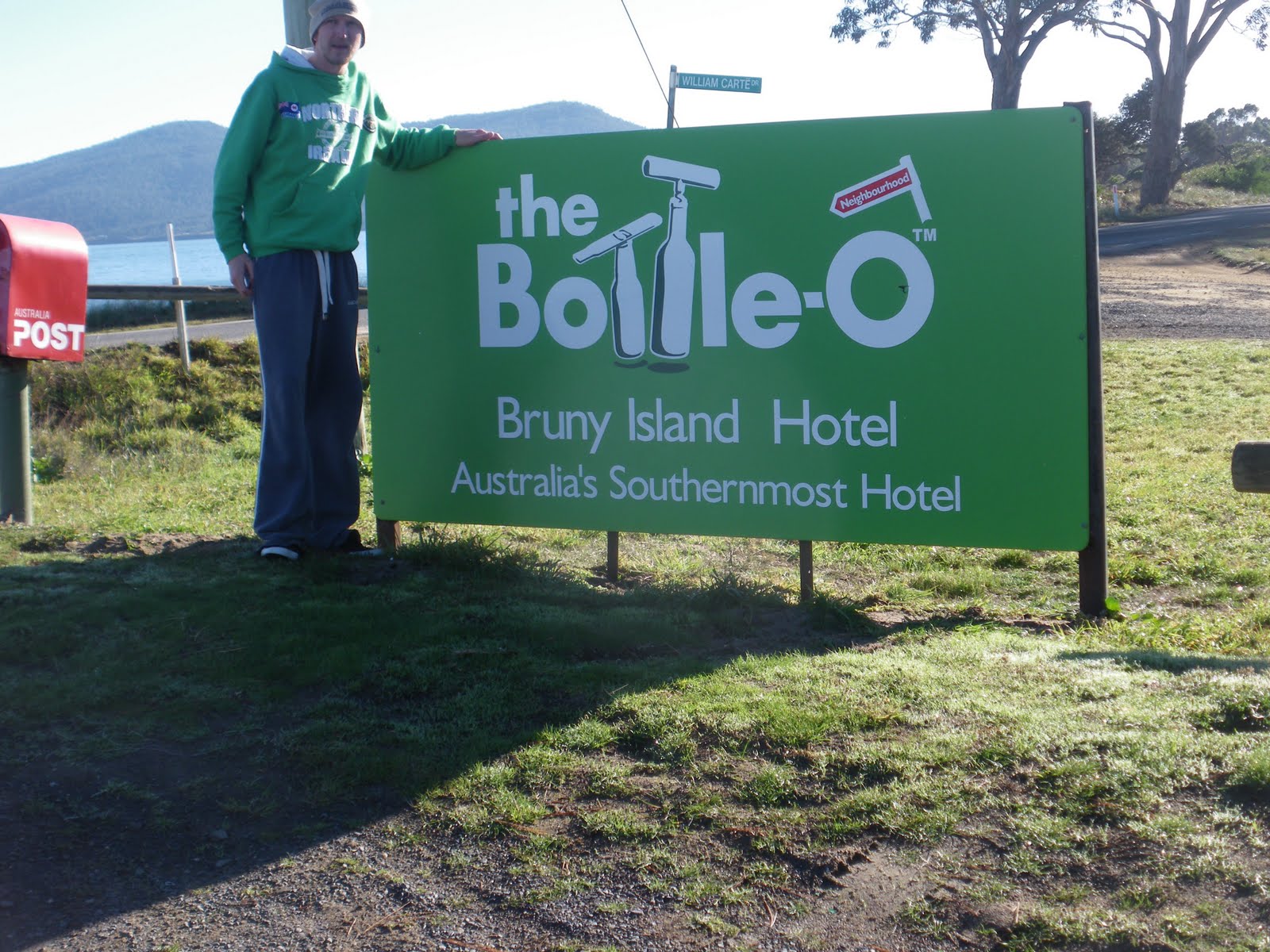 I made 3 stops in Alonnah, the capital. It’s the main settlement on Bruny Island. First stop I got my photo taken at the Bottle-O Sign for Australia’s Southernmost Hotel. The Bruny Island Hotel was one floor, a big car park and yet has a famous selling point.