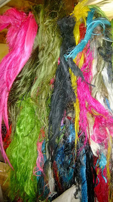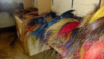 A selection of colourful lampshades that could easily double up as hats and numerous other things. All handmade here from twisting and tying together burnt and dyed grass. Using their hands only. There are not many machines at Gone Rural.