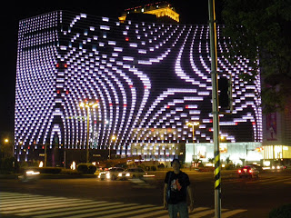 Central Park has fountains and a small lake. Plus on the way up it has a blossoming array of yella sunflowers for ladies such as Natalja to pose for photos. My photo opportunity came at the more obvious office style building on a busy crossroads corner. The building when lit up at night contains an art design featuring squares and rectangles. By day its white and black on the side and looks like any office in the world. In there the big businesses are designer clothing, brand names and world wide popular companies. It think they are the likes of Giorgio Armani etc. I just liked the building.
