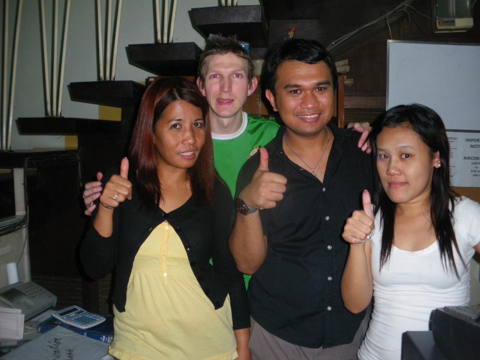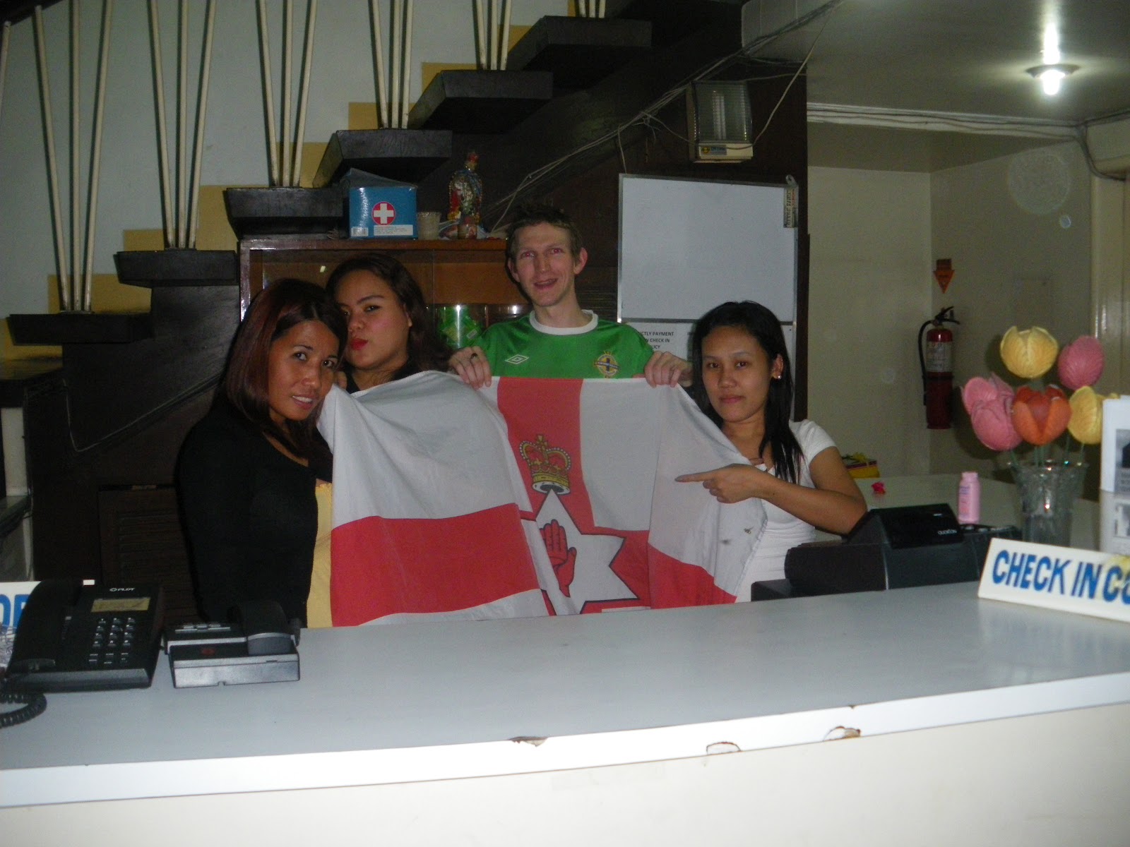 My Northern Ireland flag of course had to make an appearance. Whether its only an overnight stop or not, doesn’t mean I shouldn’t take the chance to get the Philippines girls in on the act. Behind reception.