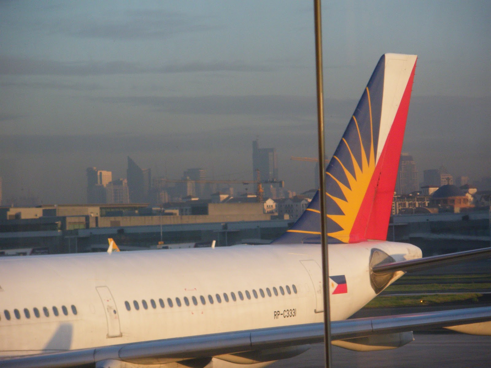 My aeroplane with its Philippines tail and flag shining in the mid morning sun with Manila’s skyscrapers in behind.