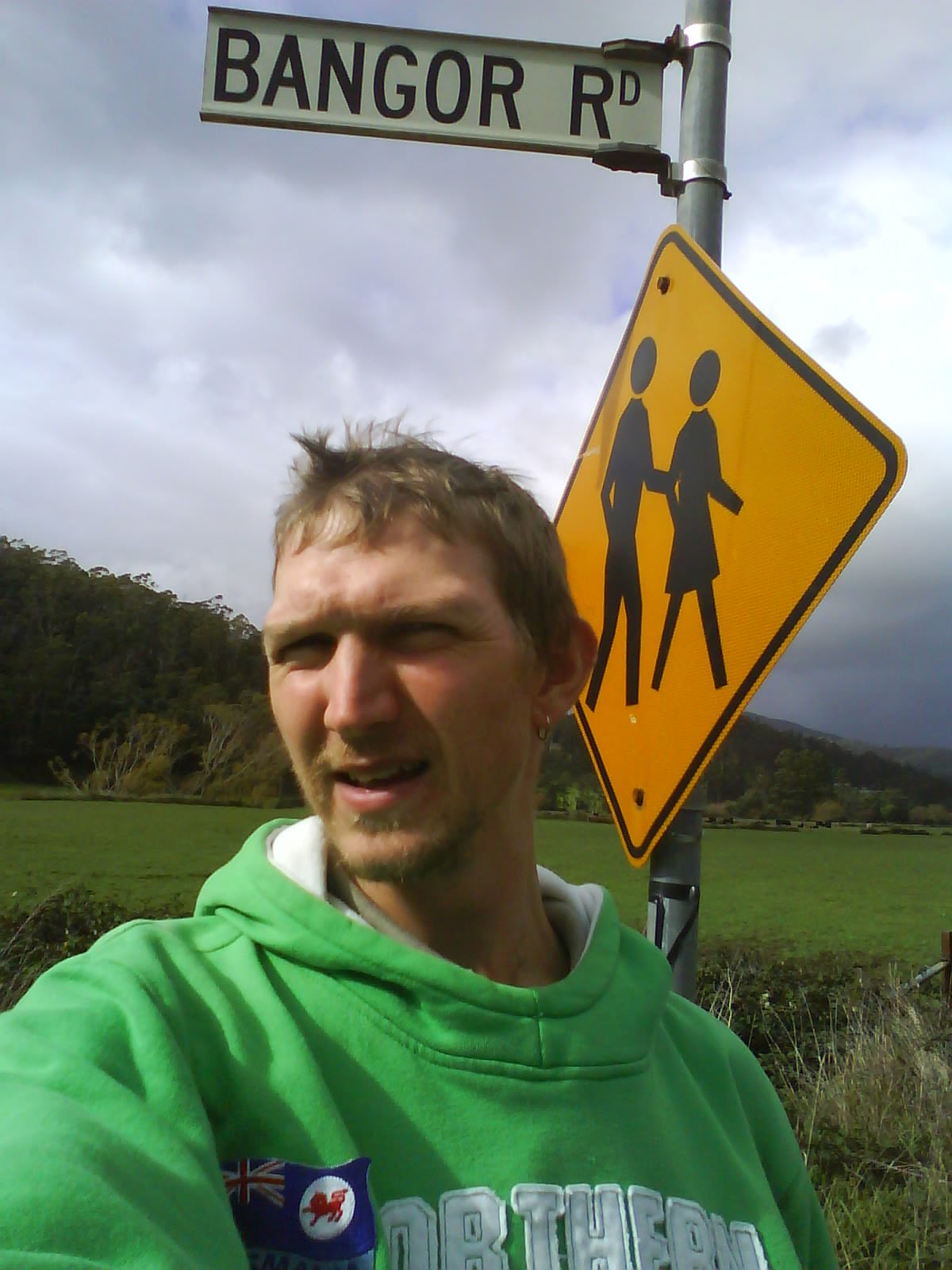 Before I went to turn round I took a right and went down to the next junction to see if there was anything there. And low and behold was another sign with Bangor written on it. This time, a confusing “Bangor Tram Road”, now I recalled the lady in Longford Library said there was a Bangor Tram. Yet there was no talk of it in the tourist information office, nor would a “Google” search on such a thing bring up any results. But apparently there was once a Bangor Tram, here in Tasmania. With no proof except a lonely white metal street sign, which bore the words in black writing “Bangor Tram Road.” I still enjoyed getting my photo taken by Bangor Tram Road. There ain’t even a tram in the Bangor I come from!