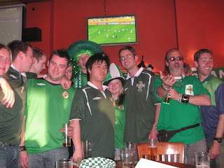 Just after this my friend Catherine came in dressed in green and Hong Kong army Alfred arrived. Alfred was a nutcase. A Hong Kong boy who had no links to Northern Ireland whatsoever but turned up at two meetings! Tim kindly donated his 125 year Northern Ireland shirt as a present to Alfred who hopefully still has it. Just after that we started to watch Argentina v. Mexico. As a fan of both Maradona and Hugo Sanchez in the past, I wasn’t sure who to support on the day, but as Mexico play in green and I had a sombrero I plumped for Mexico. The SOE NISC members were split over which team they wanted to win. The day was all going well, but new guy Ryan was causing a bit of a stir, using Owen’s Argentina fleg, he was parading the bar almost looking for a fight. He started some argument with Graham Anderson about Argentina and the Falklands War, which Graham, as the nicest bloke you’ll ever meet tried to explain the situation to him (he looked as though he was born post-1982…). Graham takes no shit as an army man and Ryan then started slabbering at an English guy who was just trying to watch the football. I think Mexico went 1-0 up while this was all kicking off. Then apparently Ryan launched a punch and hit Richboy in the face. The bouncers saw all this, I missed it, Ryan then started slabbering at Trevor, who was from the Ormeau Road ad kindly invited along for the day by Scott. Trevor got caught up in it all, as mayhem unfolded in the Tapp and Hobbitt. I’m pretty anti-fight myself. I believe there is always a better way to resolve matters other than hitting someone. Soon Ryan was banging Trevor’s head off the ground outside the pub and made it away on his toes. During this time, Ryan’s brother Jonathan offered an apology on behalf of his brother and handed me my NI shirt back, which I leant him for the day. (We still managed to lose THREE NI shirts that day. Ryan disappeared and with him, Scott Gordon’s vintage 1996 era NI tap). Soon the ambulance had arrived and Trevor was taken away. We were all too pissed and everything to know what had happenned. Needless to say Ryan and his brother were kicked out of the club straight away. Totally disgraceful behaviour, which will not be tolerated in the SOE NISC. Imagine fighting with your own people.