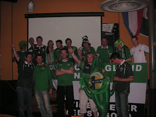 Richboy was there, as was his brother Phil from Portydown who had made it over for the weekend. New guy from Carrickfergus Ryan was there with Jonathan his brother and the turnout was looking impressive already. We drank lager and had an official meeting there, with Alex and Beverley also bringing a new club ‘member’, Zulu the cardboard NI fan. Also there Simon McCully and his girlfriend Emma, Tim Beattie and Dave King. We also had Scatt’s mate Trevor Thompson from JP Morgan turning up, a Belfast lad. Plus Hong Kong Army Alfred was due later in the day. After the meeting in O’Neill’s we posed for photos next to the pictures of Northern Irish legends George Best and Pat Jennings. I think this is the reason we chose to start the day out in there, so we could see the photos. Irish Bars are always a bit false and commercial, but it did the job, and soon we were off down the road to Bar Vin, where we would watch the first match at 3 pm, which was Sweden v. Germany. Everyone brought a random item with them for the day and we had a hell of a lot of paraphinalia on what is still the biggest day out for any South of England Northern Ireland Supporters Club meeting. I brought with me mini football nets and in Bar Vin, we held a penalty shoot out on the dancefloor, which I won, but got booed. Thats because I didn’t let Chris win, which I should’ve. At this stage I was on the Pear Cider with ice which was going down a treat (I took a lemonade before that for energy). We met two South African girls in there, Justine and Megan, one of whom was wearing green and they joined us for the day out. We got some food (free bar snacks) in Bar Vin as organised by me and watched a pretty one sided 3-0 win for Germany. I dont remember Sweden putting up much of a fight in that match. I then suggested we had to go to the beach – SOE NISC motto being more than just a piss up by the seaside! For some reason nobody else was up for it, so we ended up with a slight split. Some of us headed to the wee Irish pub Daisy O’Brien’s, some headed for food and some headed for the free open air live music festival in Bournemouth Square that day. It was rather a daze, I really expected everyone to be up for a trip to the beach in between the two games, to chill out get a carryout and enjoy the sunshine which we were graced predictably with on a Bournemouth June Saturday. It wasn’t to be and soon I was sinking a lager with the boys in Daisy O’Brien’s. We only stayed there for two drinks because (GET THIS>>>) in an Irish pub they wouldn’t let us put Irish flegs up!!!