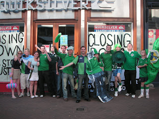 No bother as me and Sammy G put one fleg up outside the shap called ‘Quiksilver’ in Bournemouth’s pedestrian precinct at Old Christchurch Road. The other fleg we put on the railings outside Daisy O’Briens pub. At this point the local peelers asked me what we were doing. I said “enjoying life.” They laughed and dandered off. We met a lady in there from Londonderry who was with her English boyfriend and very confused by it all. Graham and I frisk searched each other using these green feather dusters. It all looked a bit camp actually. Then we did the bouncy sang songs at the Portugal boys in there and headed in search of a bar nearer the live music which would let us in wearing our taps. Scott and Sammy were watching the music and we ended up talking to the bouncer and he let us into the Tapp and Hobbitt bar who would be showing the Argentina v. Mexico match later on, which was set to be a cracker! We got some tables and beer and the place turned green!! Sadly Chris Gordon was underage and rightly so couldnt get in, which was sad for him and Sammy. I think we sneaked him in for a quick lemonade anyway!