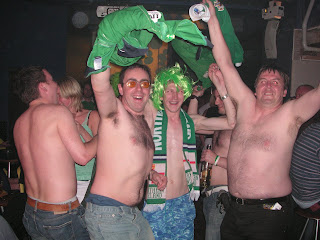 I spoke to the bouncers, worried that they might tar us all with Ryan’s brush, but they didn’t and allowed us to stay. A few people had left by that point, but we still made some noise and watched Argentina beat Mexico 2-1 in the Tapp and Hobbitt, before Owen decided we needed to negotiate our way to cheap wine and a nightclub open until 3 am. And he was right. The Tapp and Hobbitt was due to close at 11 pm, and we needed somewhere which would let us in all dressed in football shirts. I suggested the Showbar, as I worked for Bournemouth Borough Council and knew some of the staff, plus they’d let us in no bother. Then Owen saw the Consortium and decided we should try it. One quick chat to the bouncer from Owen Millar and suddenly we were sorted. All the bouncer wanted for letting us in with all our paraphinalia was some Red Bull to keep his energy levels up for the night. So we bought him some Red Bull and we were in! We found our own place downstairs and stayed there till the end dressed in green and with flegs out! We did a few “gay discos” as well, which is basically all the lads taking their taps off and dancing round the room like maniacs. Some of the girls must have enjoyed it, as one saw fit to pull my pants down! Last thing I remember Gemma was hitting me and girning so I sent her home, Owen was necking the wine, Beattie was focked and I fell over in the corner still sinking pints with Sammy G…