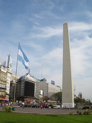 An Argentina flag flies in the calm wind, by the Obelisk.