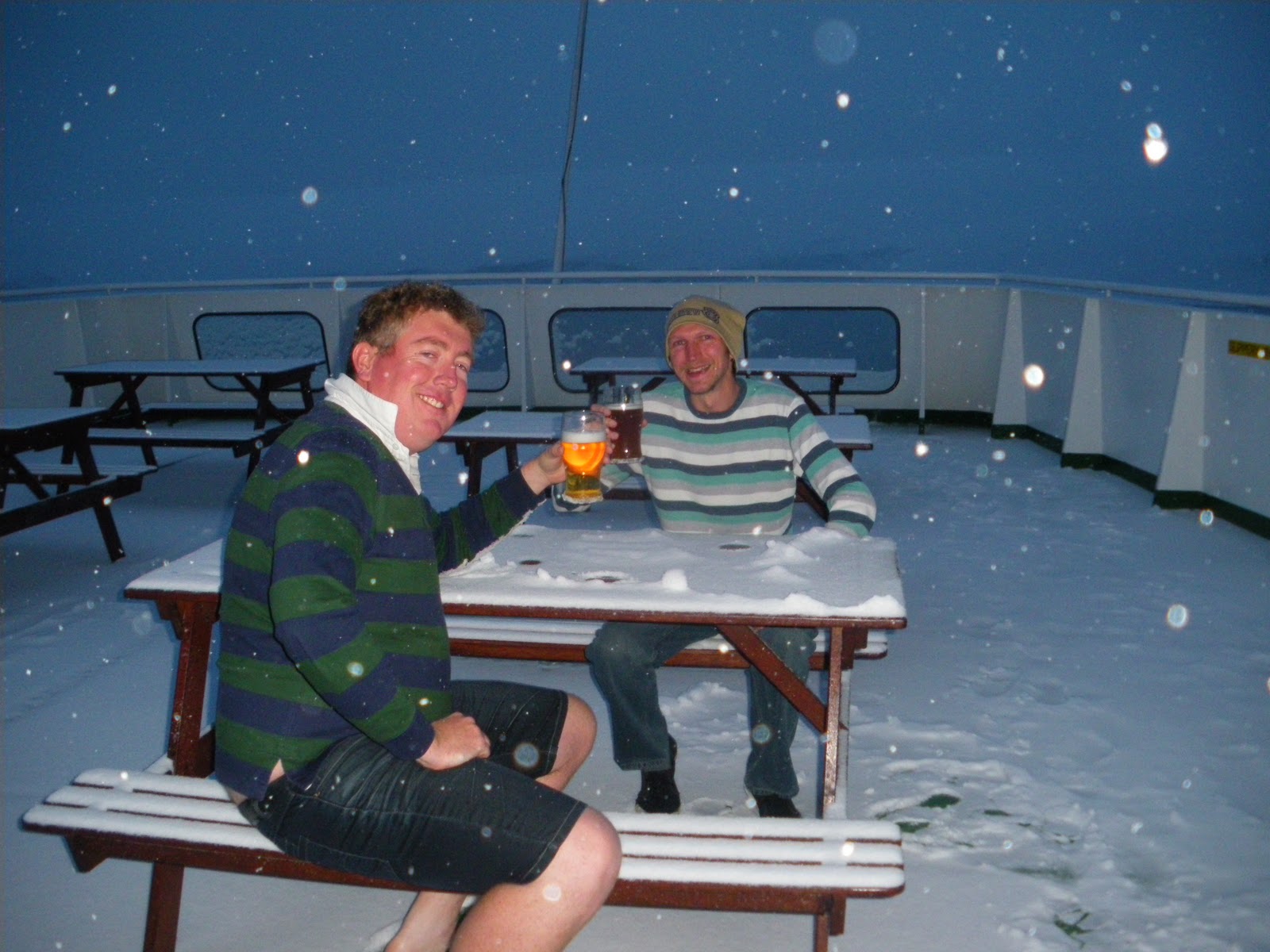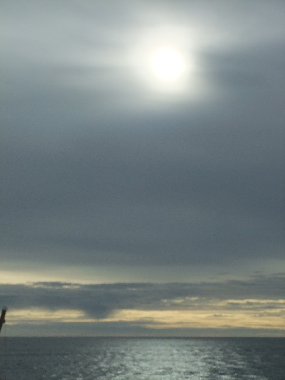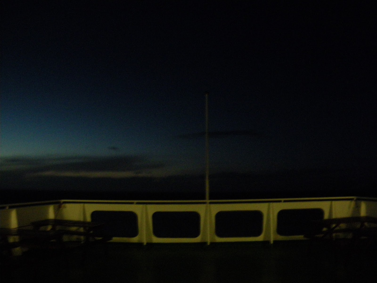 I left the bar around 2.30 am, with many still up. Sunset had passed us by on the west and sunrise had begun in the east, giving the boat the odd position of one side in darkness and the other side in early morning light.