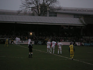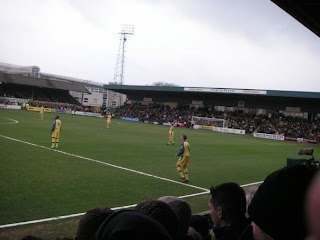 After a few pints in Seamus O’Donnells, we then got a taxi to St. Mary Church, the area where Plainmoor the Stadium is. We then went into O’Connor’s pub for some more pre-match pints. In there we met loads of Birmingham fans, who thought we were nuts dressing in green for a start, and also spoke highly of both Maik Taylor and Damien Johnson, two Northern Irish players at Birmingham. the pub was packed, but we still had time for a few beers, a kebab and then I bought a match programme, before Tim and Owen headed through the turnstiles while I got lost. Owen had got us into the Terrace Section, which was fantastic. We were in amongst the Torquay hardcore on the Popular Side. Torquay’s stadium itself is in the middle of a council estate. Its a nice tidy ground though. Owen and Tim put the club fleg up in the corner of the stadium (we got our photo taken beside it, but sadly in the fading light this didn’t come out) We got in just before kick off, with me getting lost on the way. It wouldn’t be hard to miss me dressed in green though, and soon Tim and Owen were pretending I was Dan and doing Alan Partridge impressions. “Dan! Dan!” they shouted and I heard them and squeezed my way through the yellow crowd to where they were stood. It was crampt for space but FA Cup fever had truly hit Torquay that day.