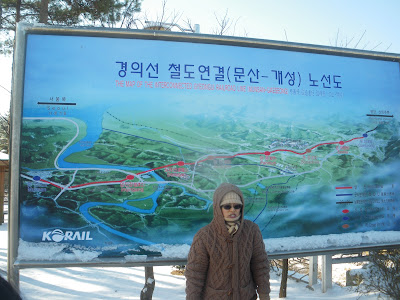 Information boards outside Dorasan Station, with a detailed map of the train line, which crosses the Imjin River. The photo has our tour guide in it, you can tell from her posture how cold it was!