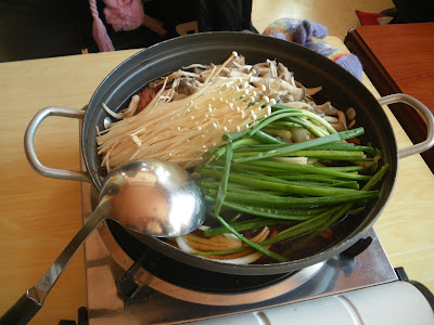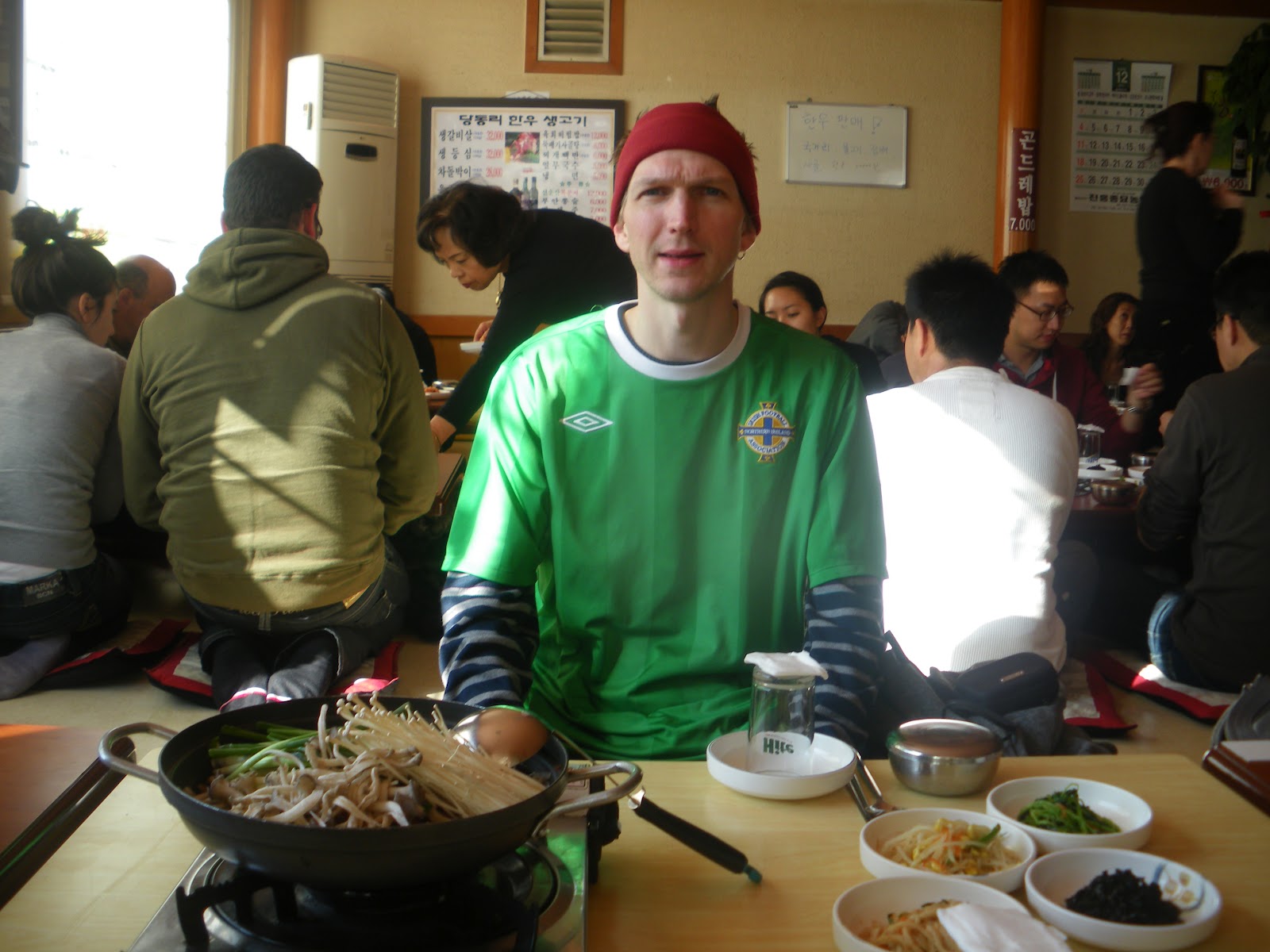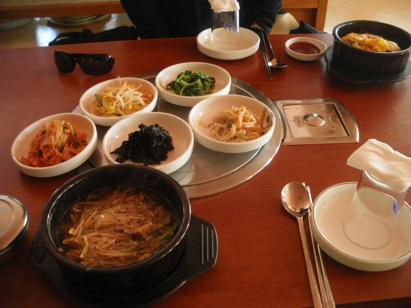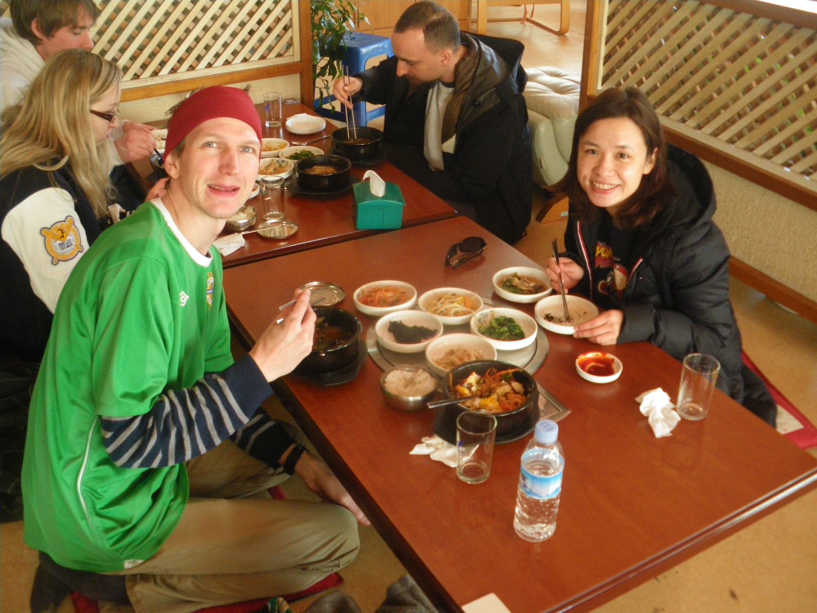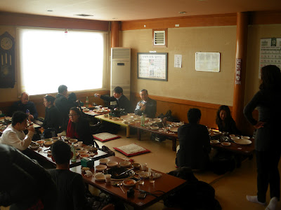 We sat on mats on the floor. As is the standard in South Korea. You get used to it – even though you either get cracking leg bones or pins and needles. We got moved to the “vegetarian” table as well for some reason!