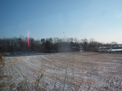 An excellent view into North Korea. Most of these photos are taken from the bus. In fact Panny and I were lucky that we were sitting on that side, as everything to our right out Panny’s window was in North Korea. Snow covered the nearby fields, trees stretched into the distance and beyond that (except for the massive North Korea flag) lies mountains and the real North Korea. The nearest real North Korean city to the border is Kaesong. That is without counting the fake, uninhabited “Propaganda Village” known as Kijongdong. And of course without also counting the border straddling DMZ village of Panmunjom (a “village” which is in theory in both countries).
