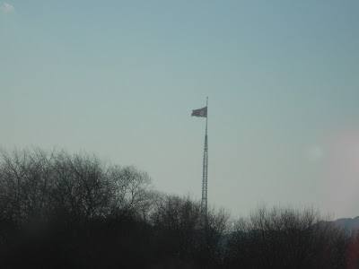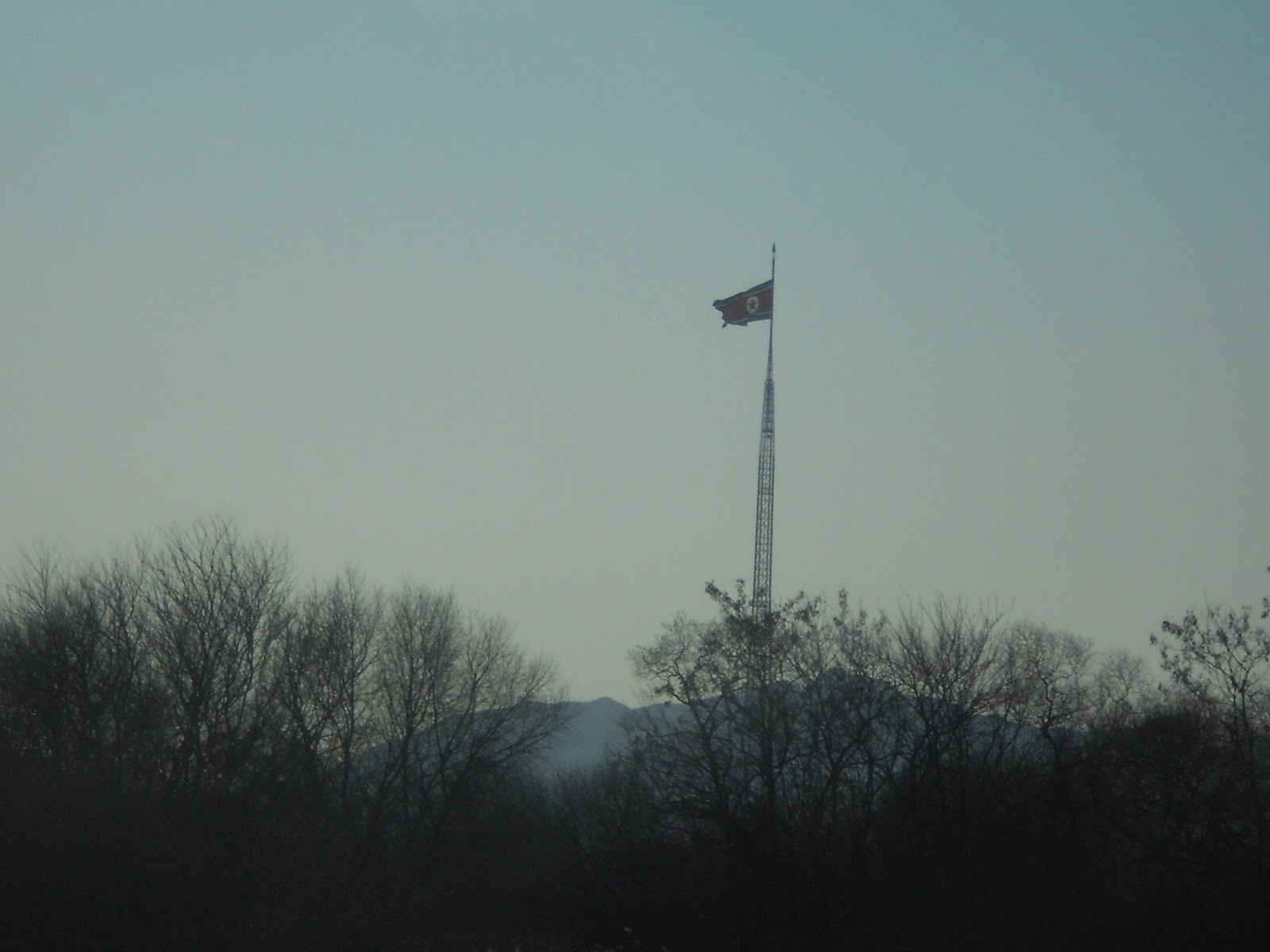 In this report, the above 2 photos were NOT taken by me at the North Korea border. This is what the flag normally looks like, at full mast, higher up.