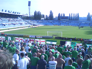 We drank beers in the hostel bar, and also in Carpe Diem bar in Bratislava Square, which also had its own special march through the streets that day, as was tradition in the first weekend of September, this was 2008. After those chilled beers it was time to do a traditional GAWA march to the stadium, this is when all Northern Ireland fans walk together singing drinking and marching direct from the city centre to the stadium. It was a good 4 mile walk through the streets and the singing was loud and the sweat was dripping my green hair dye onto my 1998 era Steve Lomas white and red checkered Northern Ireland tap.