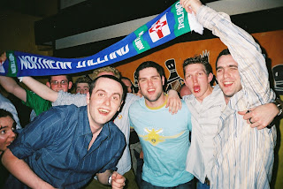 I arrived in Manchester Picadilly Bus depot around 3 pm. I sent a text message (useful things really these mobile phones…) to Gavin to find they were already in a bar in town called Teasers. However I ended up getting a taxi on my own straight to the hotel to check in and leave my bags there. The hotel was booked by Gavin and was the Hotel Camponile. I think it was in Salford, but my geography of Manchester is shite so really I have no idea. I got showered and checked in and shared Gavin’s room. I then got a bus (bit of a wait again as it was bank holiday Good Friday) from outside the Sainsbury’s nearby straight into the town centre. I’ve no idea how the fuck I found the bar they were in, but I did and soon we were sinking lagers and discussing the great times of following Northern Ireland through all the shit times. I was also surprised that Michael Beggs (Begzi) was there. Begzi had been to a few Northern Ireland matches over the years with us, but this was the first time I had seen him in at least a year. Begzi is a quiet lad, but a good mate to have. Also there was Chris from the North Coast NISC. I knew Chris through Michael and had met him a few times before, most memorably in Hunters after the Northern Ireland 3-3 draw with Austria the previous year. And then Philip was there as well. Philip was Michael and Gavin’s younger brother who was also a big NI fan and had been with us at a previous away match v. Wales in Cardiff. The atmosphere was great as we watched Barnsley win 3-0 at Luton (a match which held particular interest for myself as a Cherries fan) this was because we wanted to catch up on Luton. We had started drinking in Teasers and then moved on to Walkabout. After this we popped into Brannigans for a quick beer before heading back to hotel to get ready for the night out.