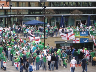 This was on top of the two girls we had met the night before and the usual crew of me, Michael, Gavin, Philip and Begzi. In there I also met Toddy and Nolers from the NoE NISC. They were handing out balloons and all sorts of green things. A few England fans came in as well, these were the first I’d seen and the banter was good, though in reality we knew they would win the match. Millionaire footballers against the likes of Whitley and Murdock, we weren’t going to stand a chance.