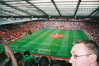 Once inside the stadium I had the taste for beer again, but they didn’t sell it, so I had to make do with a cola. I then put a ridiculous bet on. I spent £5 on England 0-1 Northern Ireland with Keith Gillespie scoring. It was a nice dream to have. Inside the stadium we were high up behind the nets, with some other noticeable green shirted Northern Ireland fans at other points round the stadium. It was a total party atmosphere! We knew we would lose but we bloody well enjoyed ourselves. The sour faced English fans looked up in disbelief as we danced, sang and bounced before the match had even begun. Then came the National Anthems. Proudly I stood for God Save The Queen, some English people looked confused. I tell you what, they should bloody well know we exist by now! Our National Anthem (and one which I love, respect and sing) is also God Save The Queen. It was great to sing it at Old Trafford, especially since we were louder than the English at singing their own anthem! A classic moment. Why so many English people think Ireland (as an island) is one country is beyond me. It annoys me, I have to correct at least one person in England every week. Its not Ireland, its either Northern Ireland or the Republic of Ireland (or Eire as the name states).