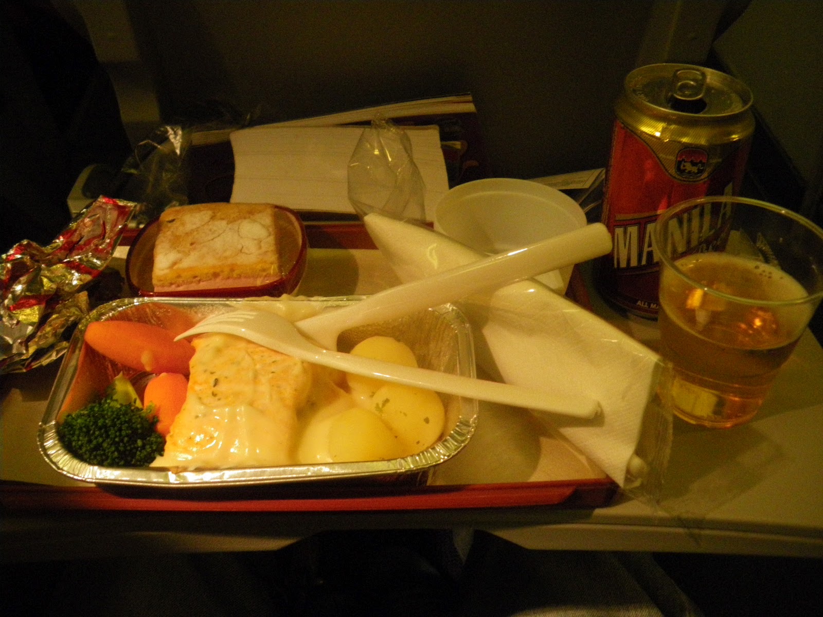 The onboard meal. Immense. I devoured the lot! I love aeroplane food. This just a couple of hours after downing my airport pizza. Would mean no meal later on in Manila, which suited me fine. The food was cooked salmon, potatoes, carrots, broccoli and cream sauce. Strawberry Ice Cream Cake for pudding, and of course the beer was free.