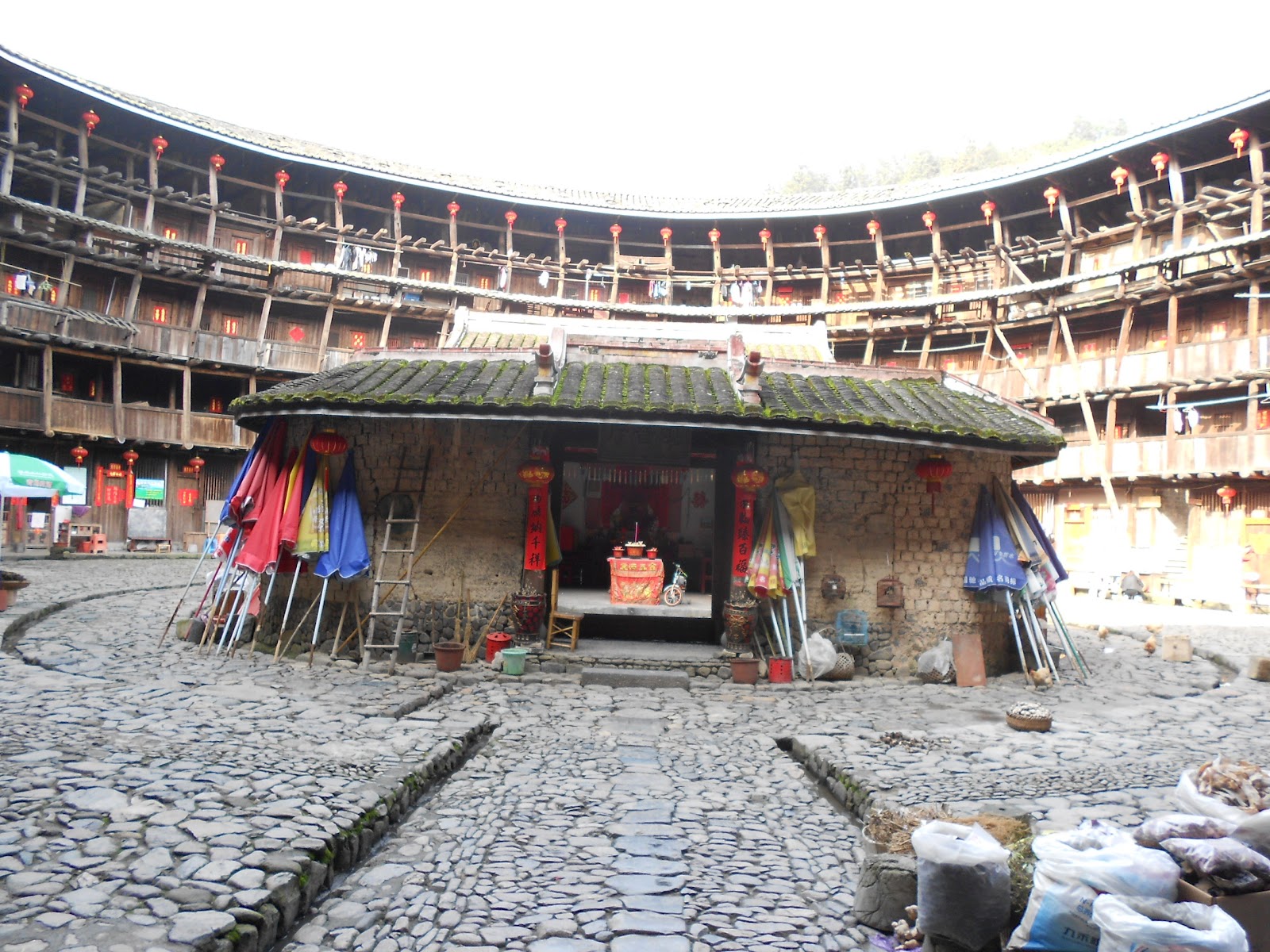 Some of the living quarters. A small bit of history about the building then – it is often also known as the tilted building, which you cannot see from the outside, but once inside the walls seem to have a slight tilt on them. Especially when you look at some of my photos of the supporting pillars. The greatest slant is at an angle of 15 degrees and these are on the corridors to the right and left as you go in. The building was built by the Liu, Zhang, Luo, Tang and Fan clans in the area and around 1308 – 1938. The Yuchang has 5 storeys.