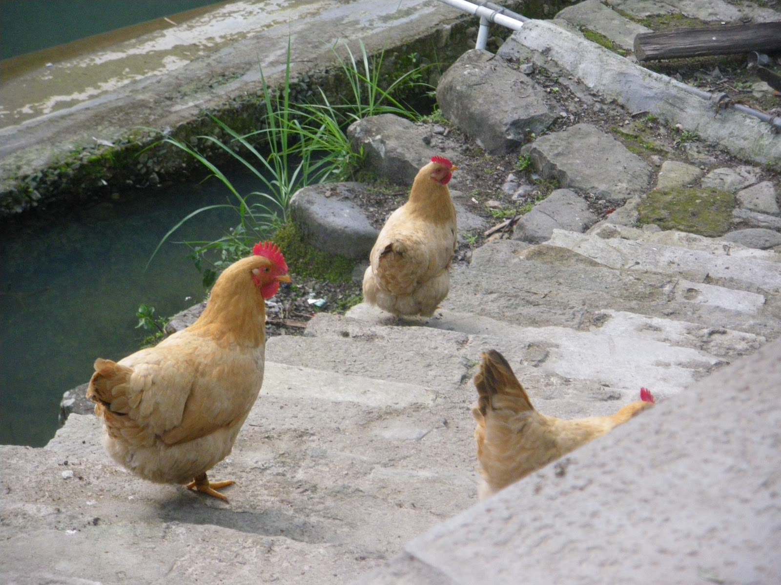 Hat trick of chickens. Or roosters. They are everywhere.