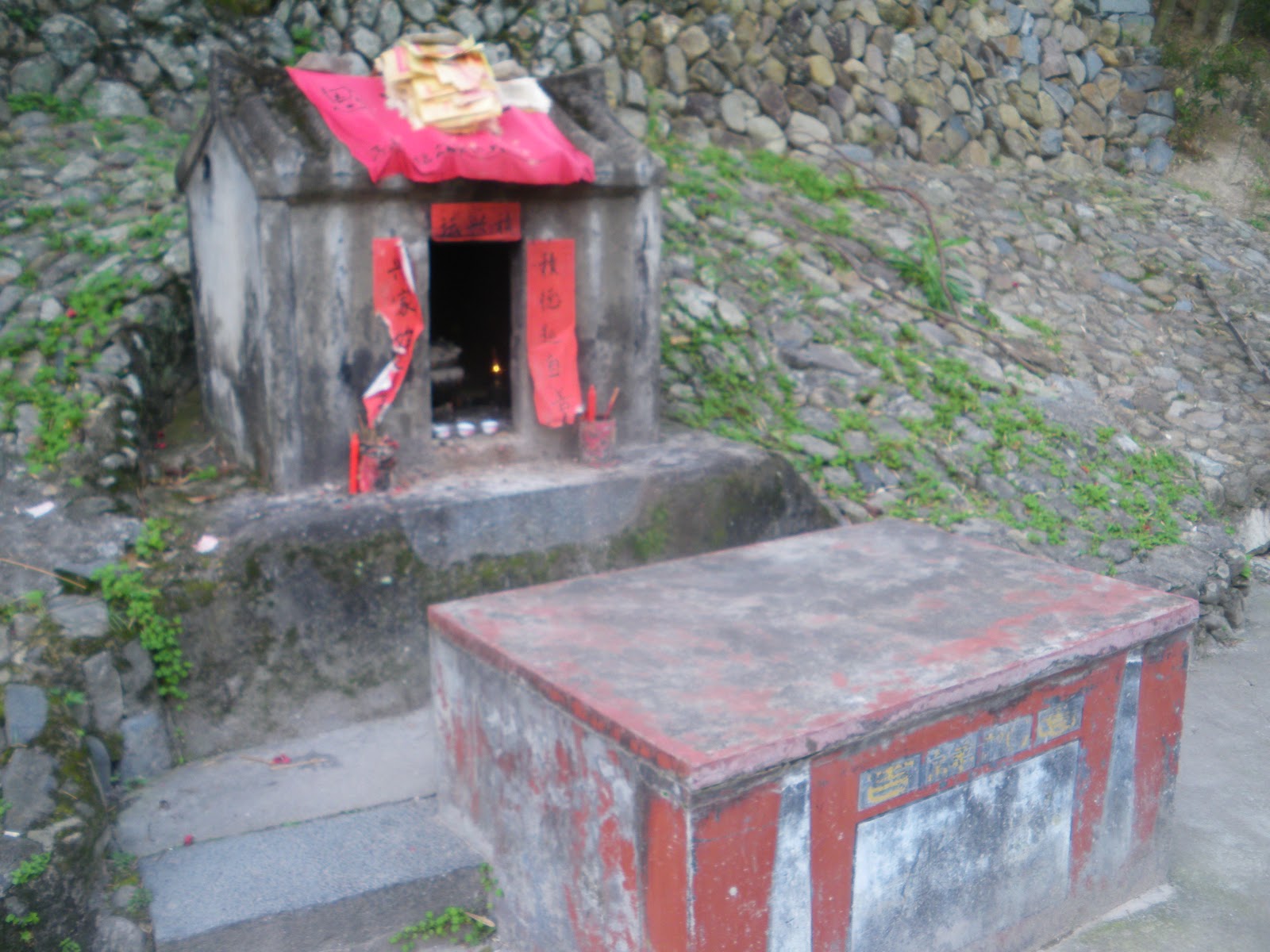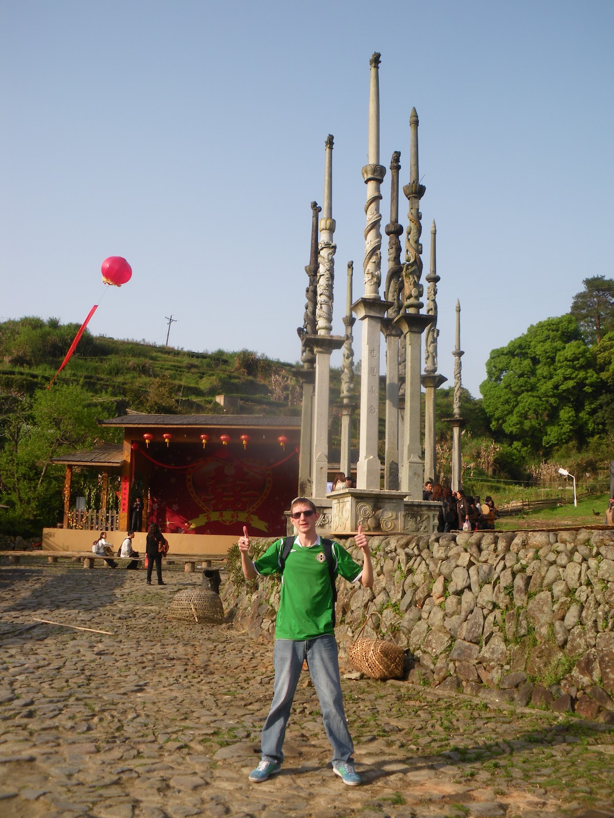 These concrete pillars are related to the ancestors and founders of the village. In my book they were listed as Ancestor’s Worship. Panny asked one of the locals the meaning and they confirmed it was a mark of respect for those who had gone before. Nice chance to get a photo of the Northern Ireland flag. I mean who would take a Northern Ireland flag to Taxia Village and up to an area called De Yuan Tang? If anyone else has ever done that, please get in touch!