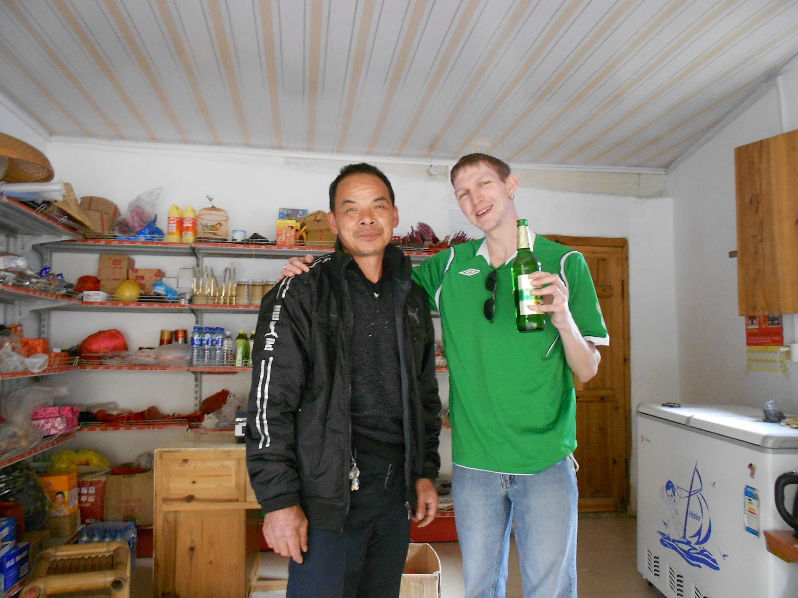 We walked back down away from De Yuan Tang and I found a wee shop which was basically this guy’s lounge but he sold beer. Strangely he didn’t keep it in the fridge, so I only bought one bottle. The cost was 7 Yuan (RMB). I think that’s about 50 pence. It was a 500 ml bottle and I was able to open it and walk round the village enjoying its sensations.