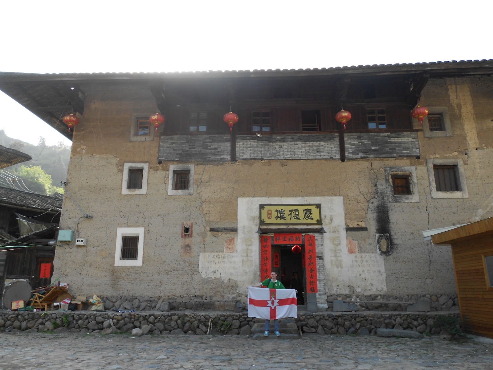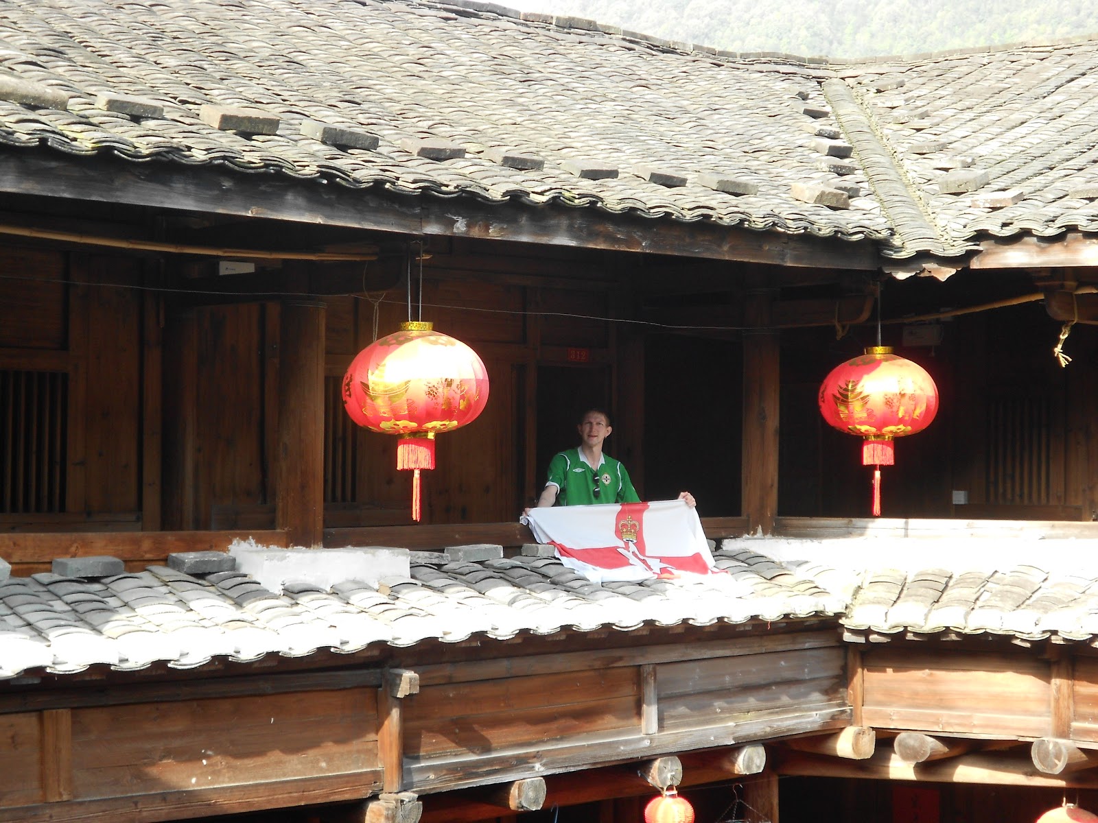 On the balcony on the top floor of the Qingde Building. Not many to have stayed here would have worn a Northern Ireland shirt.