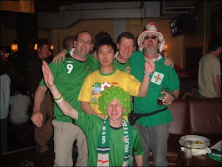 Then West Ham defied belief AGAIN and went 3-1 up, surely now the Cup would be theirs! Teddy Sheringham came on as sub amidst chants by us, and it looked all over, even when Liverpool made it 3-2, West Ham were defending well and deserved the FA Cup. The match went into the third minute of injury time with West Ham’s hands on the cup and then the ball fell some 35 yards out to Steven Gerrard. If anyone could be relied on giving it a go from there in the last minute, it was Steven Gerrard. To our dismay, he blasted a volley right past David James and into the net for a nuthead equaliser. Suddenly West Ham’s dream looked to be over as the match was now 3-3 and headed into extra time. The history books will show that only Teddy Sheringham scored a penalty in the shoot out for the luckless hammers who missed three and lost 3-1 to Liverpool in the end. At this point Simon and Tim bought and burst open bottles of champagne which was great craic. I then presented an Ireland shirt (Owen got it free) to the English guys who had won the FA Cup Quiz I did. Then we noticed a Chinese looking guy wearing a Brazil top and watching the match on his own! We started singing at him “We’re not Brazil we’re Northern Ireland” and he looked totally bamboozled! Not as much as Owen and I when we asked what his name was and he replied “Alfred.” Now this guy looked about 20 so it was hilarious that he could have the name Alfred, which most people called that were over 70! It was nuts. We then adopted him as a member of the GAWA and by this point, Owen’s mate Carlo had also turned up. Then Richboy, the Southampton resident suggested we move on to “The Parot Pub”, where we put the flegs up and put classics like REM – Everybody Hurts on the dukebox. A few more swallies in there and we were all lit, anyway after this, we got some photies all drunked up by the Bar Gate before blagging our way into The Hog’s Head….
