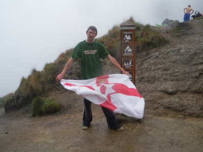 I flew my Northern Ireland flag by the sign at Warmiwanuska – from there you are standing on what appears to be a dead woman lying down. Further up, as you can see a Canadian dude gets topless. Despite the chill I felt obliged to lose the robes too.