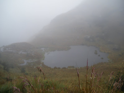 It was at the top of this ascent that we saw a lagoon – aided by the extra rain, this was a bit of extra sightseeing. None of the group wanted to linger and we made our way down fast to Sayaqmarca, an impressive Inca Ruins further down and with views over misty landscape.