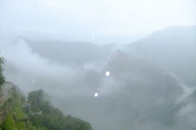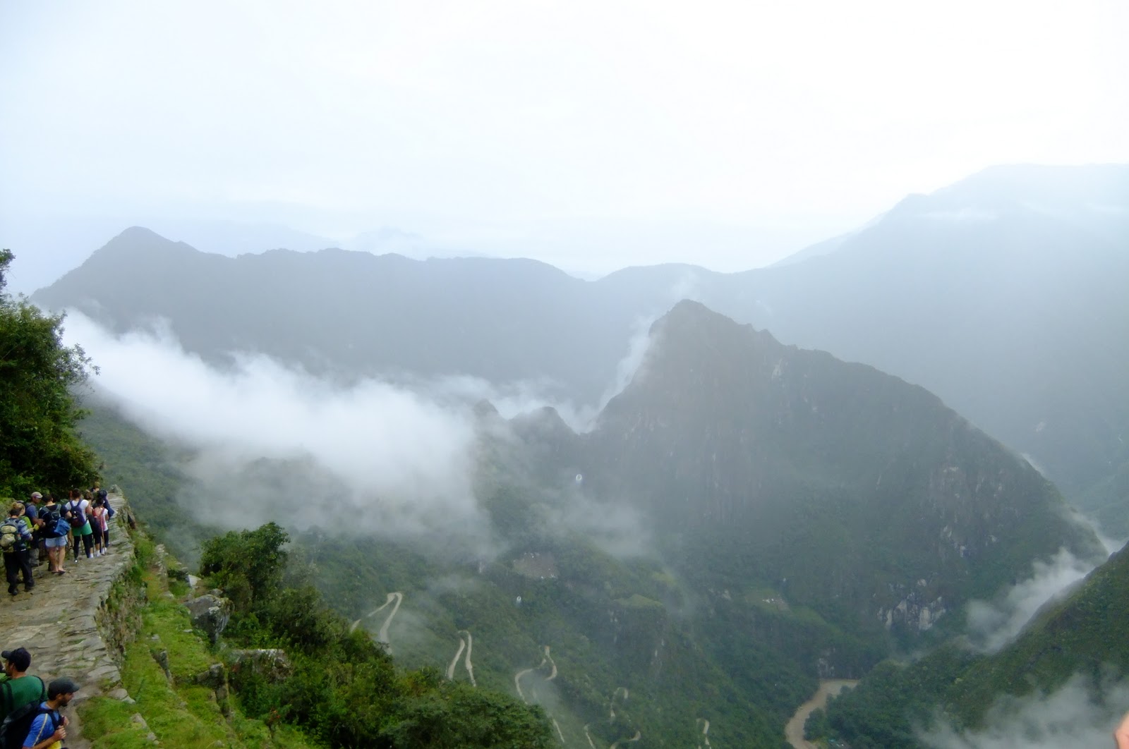 Because at Intipunku we were told we would get our first glimpse of Machu Picchu. Clouds and mist were in the sky which also took time to drizzle on us.