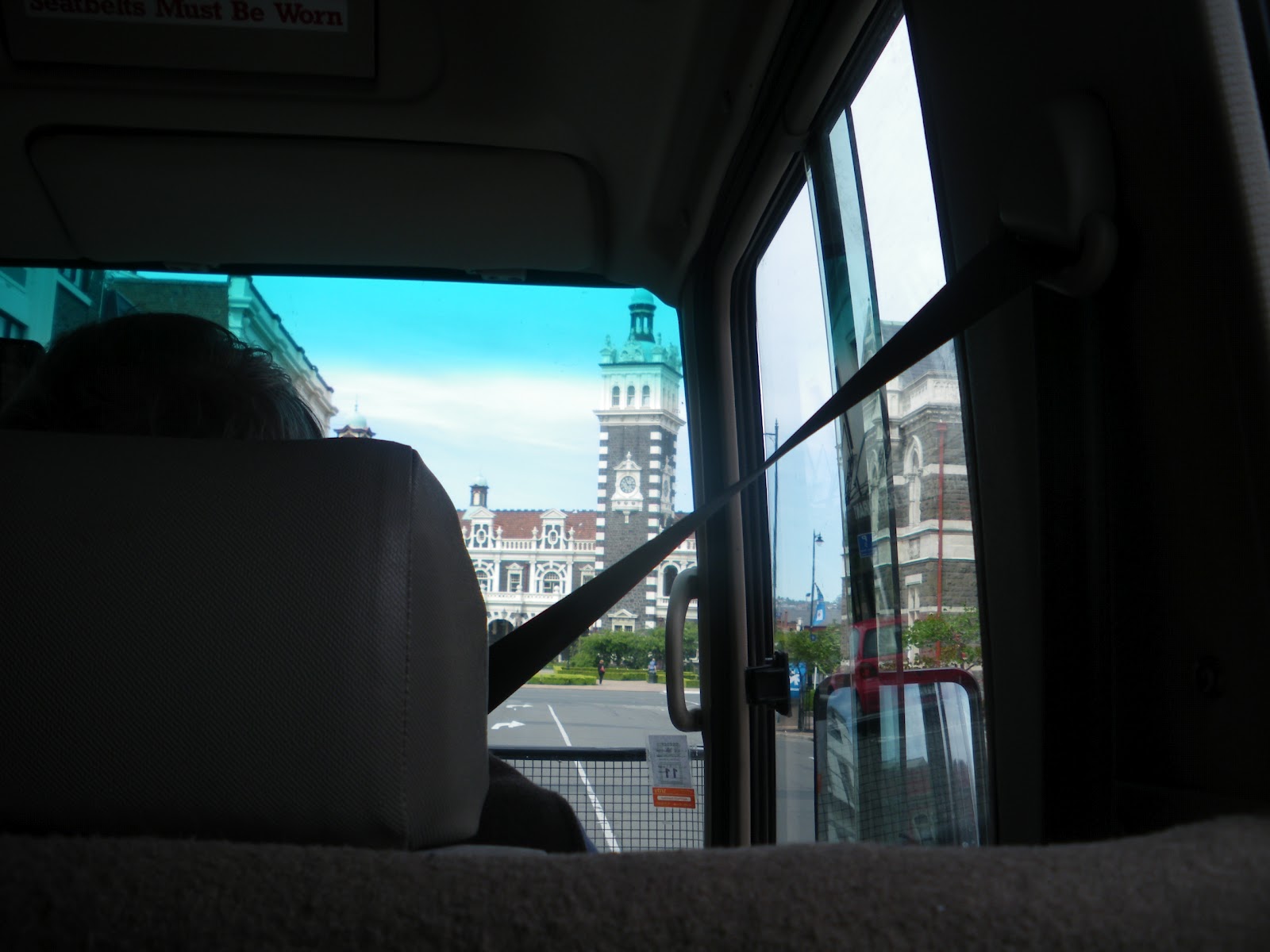 Driving through Dunedin – Edinburgh of the south. You can see the excellent Railway Station pictured from my bus above.