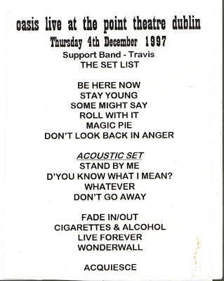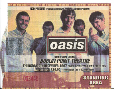 The problem was I wanted 3 tickets and there was a limit of 2 per person, so luckily Andy and his mate only needed 3 tickets and were further ahead in the queue so they got me the extra one. There was only about 100 tickets available for each night of the concerts that December at Dublin’s Point Theatre. In them days Oasis didn’t play gigs in Northern Ireland, so we had to travel down south to see them. The two dates were a Friday and Thursday night in early December. I didn’t have a preference as to which night I went to, yet for some reason the first 40 odd people in the queue all chose the Friday night, presumably cos it meant less time of work and would have worked out better for Ulster travellers to Dublin. When it got to Andy in the queue he shouted back if a standing ticket for the Thursday was OK, and it was. Then when it got to me, there were only seated tickets left for the Thursday night. Obviously straight away I bought two, meaning I had the 3 tickets I wanted, all on the same night, but one standing (the one I would take) and two seated. In those days of course there was no texting, mobile phones, ebay or internet or fans forum, so swapping the tickets never occured to me. I just wanted to get two mates to go down there with me to Dublin, and would happily have stayed with Andy and his mates for the gig, and let my other two mates sit together. It didnt matter. I was going to see Oasis AGAIN!!! And back in 1997 when they were at their peak. The day I got those tickets is still one of the happiest of my life.