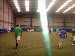 John and I made it to Victoria Coach station easily on time, but the megabus was delayed, and left an hour or so late. The traffic to Manchester was also very heavy, and it became obvious that we wouldn’t make Manchester by 12 noon, never mind the actual tournament. I was already dressed in football gear, although with a green wig. John and I had a few beers and tried to liven up boring passengers on the megabus. They weren’t amused and continued to be boring. Once out at Manchester (having left voicemails and apologies to all those who expected us to be there at 12 noon), it became obvious that we wouldn’t get to the Soccerdrome by 2pm!!! Thus missing the entire tournament and the reason for the trip. However rather than wait for a bus, John and I decided just to share a taxi and not worry about the cost. I made it for 1.30 pm, where most of the South of England NISC matches had already been played!!! On talking to Owen Millar, we had done alright and they looked a bit tired so I agreed to stay outfield for the entire last match as I had fresh legs and should play better in theory. This despite not playing a football match for about a year, and not playing a refereed match for about 7 years. I came on wearing my AFC Bournemouth shirt (our team were in red), where I first met Squid, a hard nut in the centre of midfield/defence (as five a side makes you play). I still can’t remember if I played in two matches or one, it all went so fast and we’d had a long bus journey, a few beers and not much sleep. What I do remember is scoring two goals in our 5-0 win over the Continuity NoE NISC. I also hit the post and was denied a hat-trick. Owen had filled me in on all the scores, and we had done really well since none of the team had played together so far. In the end we were leading 2-0 against both the North of England and Scottish NISCs, but ended up losing 3-2 and drawing 2-2. Still it was great craic. I’m just gutted that the megabus was late and I missed the first 3 matches, the chance to put our club fleg up with the others and a team SoE NISC photo (which we never did). I headed straight to the bar in the JJB Soccerdrome for my post match pint!