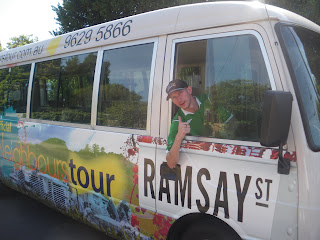 All the ones from the hostel got onboard, I was near the back of the bus, and we did a first stop by another hostel, Nomads I think, where I had to register by online ticket and confirm we were all onboard. That was the leaving point for the official Neighbours tour. I bought a wee Ramsay Street postcard there for my wee brother Danny (he probably doesnt watch Neighbours or even ever has for all I know – but at least a part of my cherished undigital childhood could work its way into his digital childhood brain). More people got on there and the bus was full, I even noticed a boy in a Northern Ireland football training top, I was wearing my Northern Ireland shirt as well. All on board and Gerry launches into the introduction and starts the stories coming. Flashing us back to the 80s and 90s in a way only a man with passion could, we are put at ease knowing a guy with a sense of humour is on the wheel of the bus.