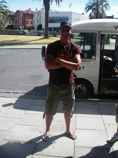 We take a bit of a detour next down Dandenong Road and an area called Orrong. WE are on the hunt to meet a real former or current Neighbours cast member. Gerry eventually drives us down to St Kilda Beach, and outside the famous Palais Theatre. He gets out of the bus and makes a phone call. Our star will be here soon and we all exit the bus. Soon we see a well built gentleman walking down towards us all, with a backpack on, wearing shorts and t-shirt and a baseball cap. Looking as normal as he could. I thought at first that it was the Swedish golf star Jesper Parnevik. But I was wrong it was Daniel O’Connor, who played Ned Parker in Neighbours. Some of the girls recognised him, Lynsey the Welsh girl was obviously a bit of a Neighbours fan and got her Mum to chat on the phone to him!