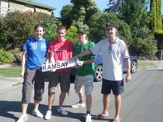We take a left hand turn into a long hilly road. Then we take a second left, where we pull up in a cul de sac called PIN OAK COURT. Just the perfect cul de sac and not dissimilar to the one where I grew up (Marlo Drive) in Bangor Northern Ireland. Of course, for now, this isn’t actually Pin Oak Court. Its Ramsay Street. It gets even more unrealistic as Gerry grabs two fake street signs from the bus, both with “RAMSAY STREET” written on them even in different style lettering than the way/font style and layout of the street sign for the real street “Pin Oak Court”. One of these fake street signs is given to the girl on the bus whose birthday was closest. The other street sign, Gerry grabs a pole and puts it on the end!! Making a fake Ramsay Street sign just for all them there photos!!!