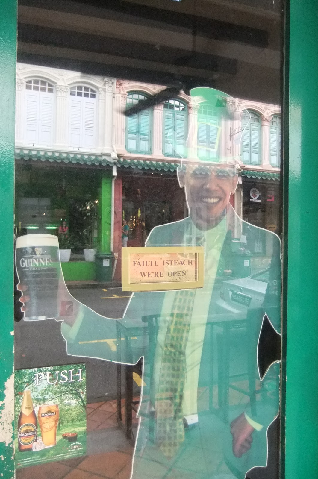 I alighted at Tanjong Pagar station and found O’bama’s Irish Pub almost immediately. On a quiet street, it stood out. The sign above the door featured the President himself flying an Irish Tricolour flag and a Singapore flag, whilst holding a pint of the green stuff (you know that beer drunk by leprachauns, but only in Ireland). In keeping with the President’s speeches, the slogan read “Change you can drink to…” (a take on Obama’s quote “Change you can believe in…”).