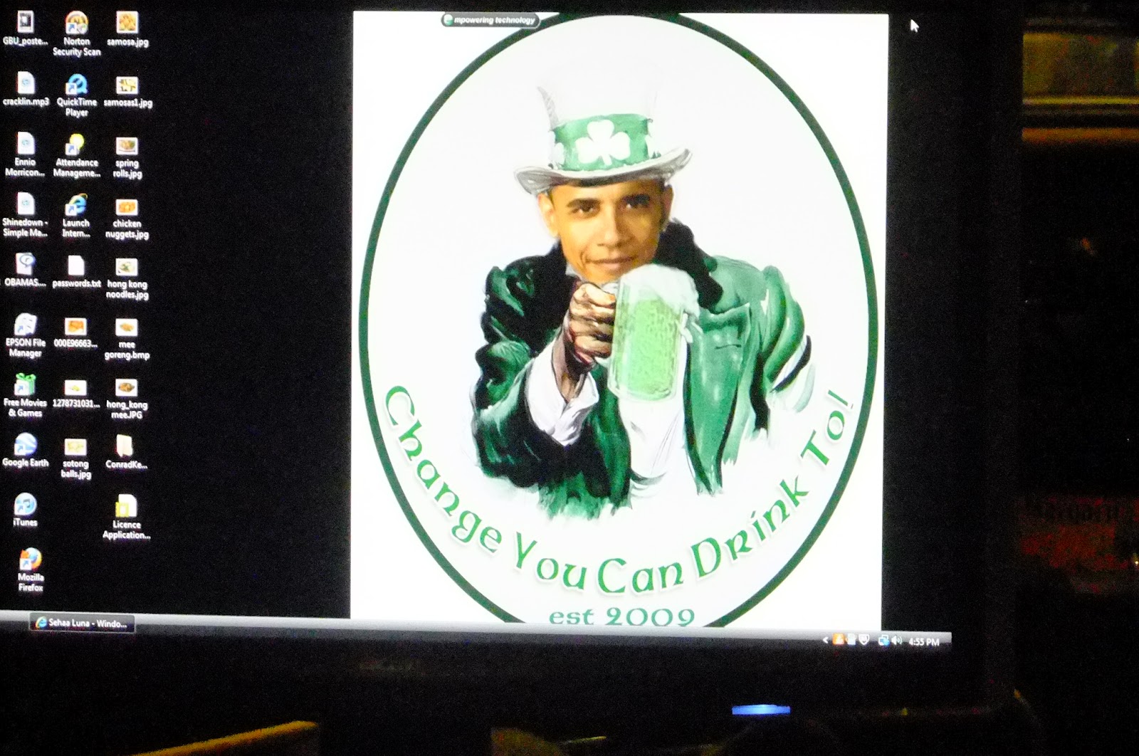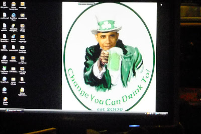 Saying “cheers” or “slainte” with the man Barrack Obama himself. He’s wearing a green hat in Irish style and I have my famous blue hat on.