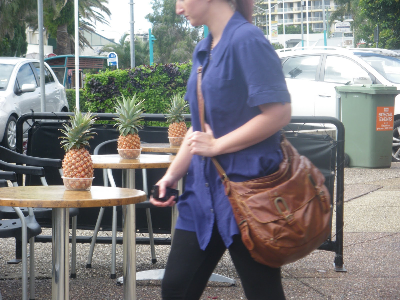Pretty girl walks past a hat-trick of pineapple cocktails. After a walk all round the town and a wee jaunt to the beach, I found solace in the free parking and afternoon sun of Coolie seafront.