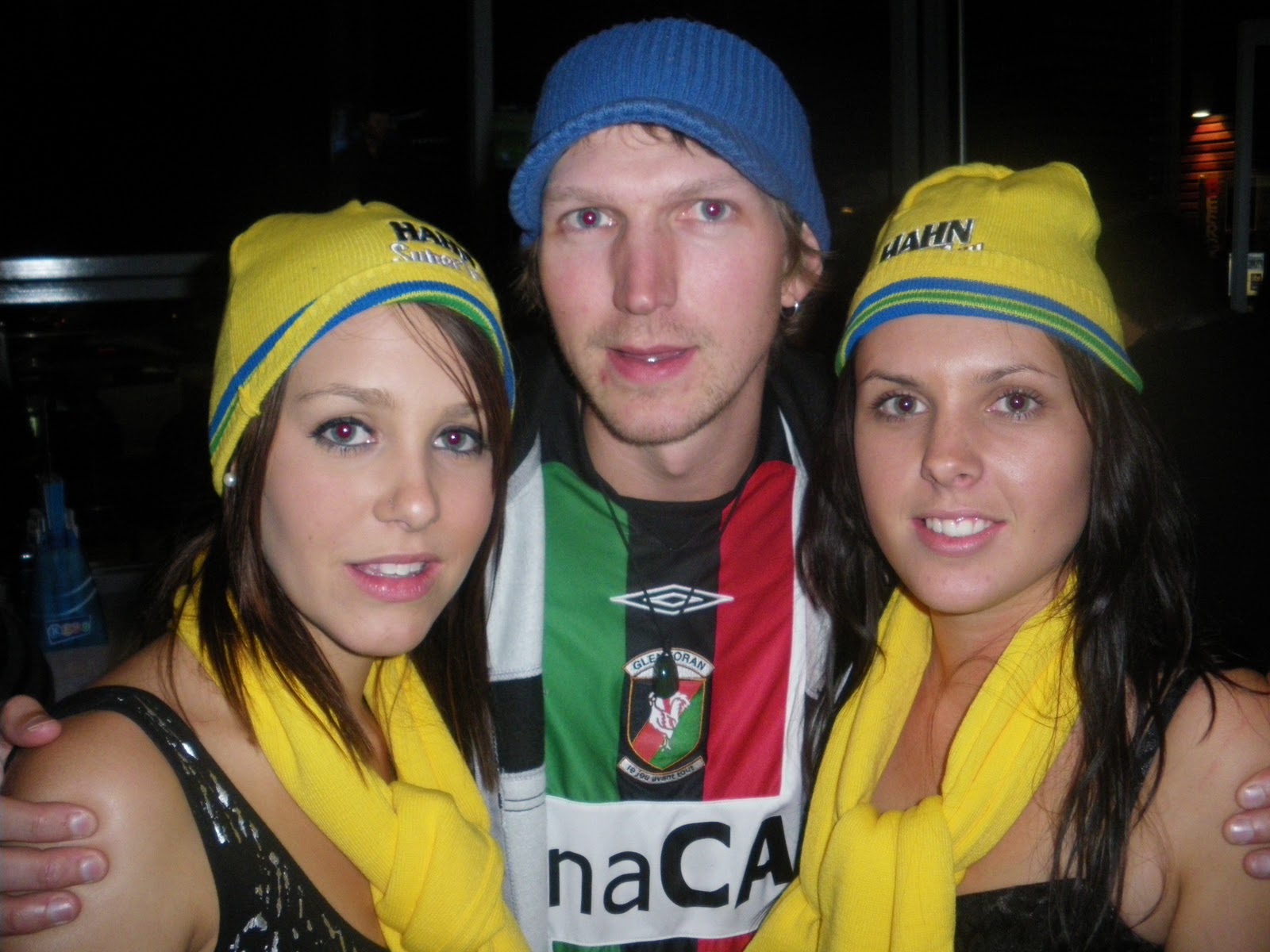 Having a drink with two hot New Zealand ladies. Australia had just been knocked out of the World Cup so we got all these free flags, scarfs and hats.