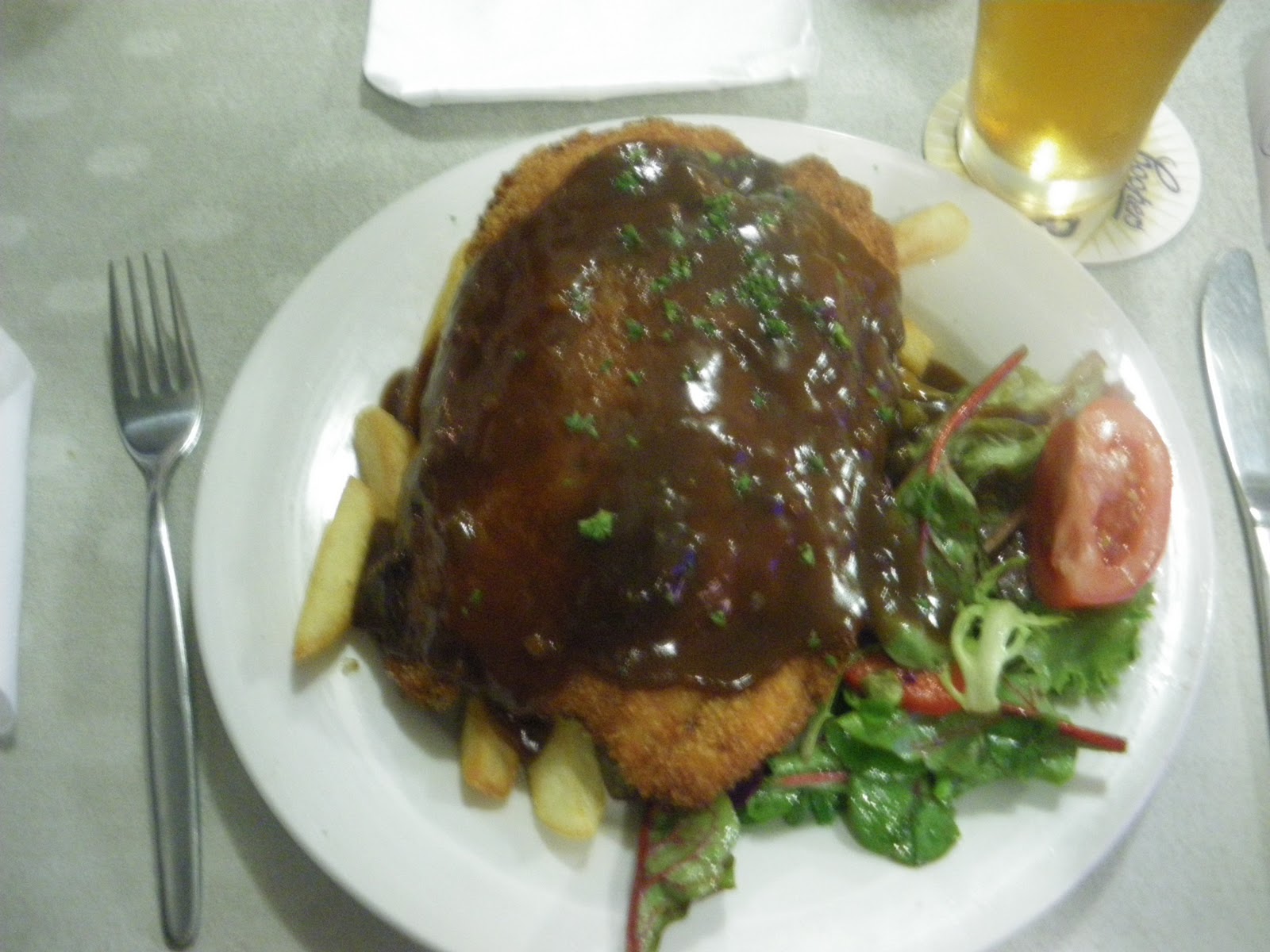 Dinner at the Surf Club. For $10 we got this Chicken Schnitzel meal and a beer!