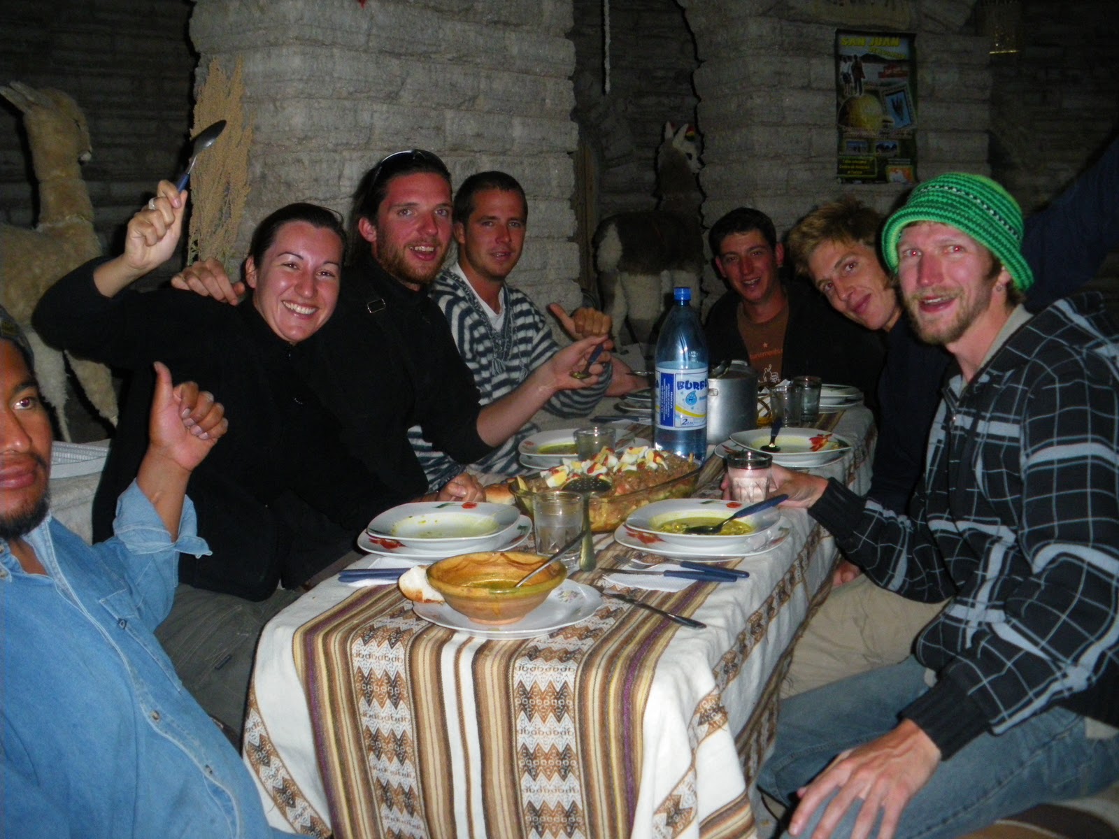 There were 6 of us on the Jeep Trip (Benoit and Guillaume from France, Alina from Romania and Jorg and Tom from Switzerland) plus Wilma the chef and Christian the driver. The first night, after an amazing day driving on salt from Uyuni past Colchani and walking on an island on salt called Incahuasi, we arrived at our hot and peaceful base for the night – here at San Juan De Rosario.